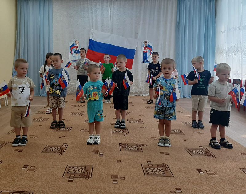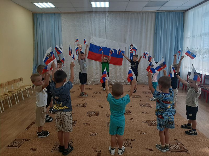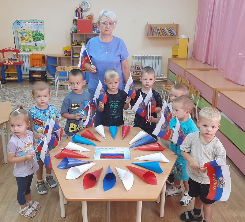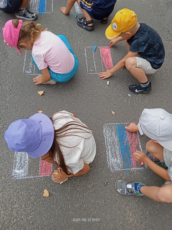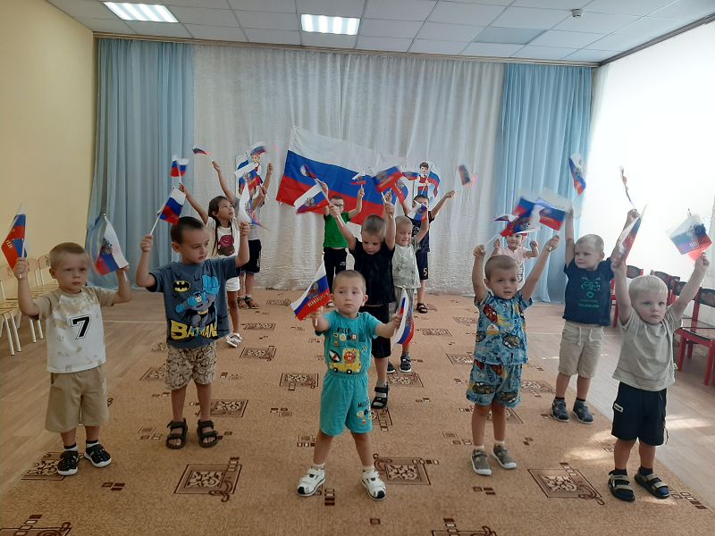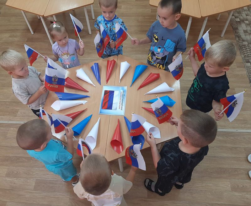 Ежегодно 22 августа в России отмечается День Государственного флага Российской Федерации. В этот день в дошкольных группах прошёл познавательный час «День флага», на котором дети узнали об истории появления Российского флага и его значимости для нашего государства, участвовали во флешмобе, играли в игры «Передай флажок», «Собери флаг по цвету». Дети с энтузиазмом взялись за мелки, и нарисовали на асфальте триколор.