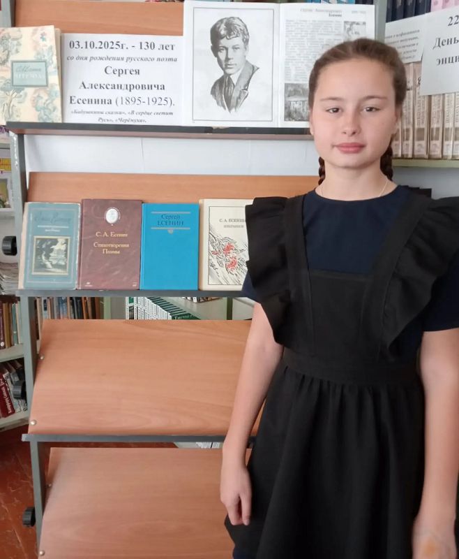 В преддверии 130 – летия со дня рождения С.А. Есенина в библиотеке МБОУ Михайловской СОШ была оформлена книжная выставка: «03.10.2025г. – 130 лет со дня рождения Сергея Александровича Есенина».
