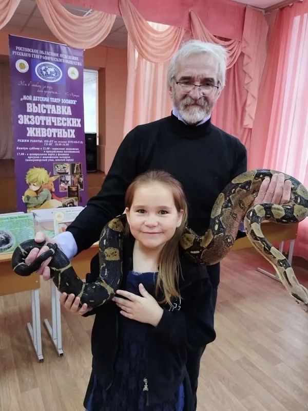 Прикоснулись к удивительному миру живой природы. Ребята познакомились с императорским удавом, домашним кроликом, пятнистый леопардовым эублефаром, бородатой агамой, тигровым питоном, маисовым полозом, синалоанской молочной змеёй, тонкохвостым полозом и др.