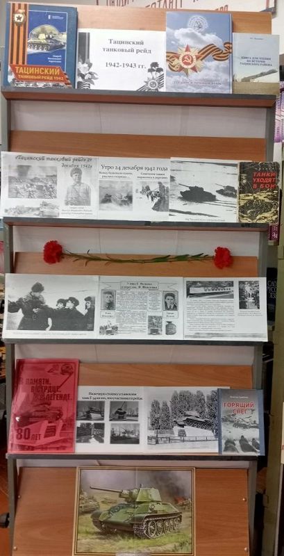 В преддверии 83 годовщины Тацинскому танковому рейду в библиотеке МБОУ Михайловской СОШ оформлены выставки: "Тацинский танковый рейд 1942-1943 гг.", "Она сражалась за Тацинку". У выставки учащиеся 6-Б класса: Божко П., Манунов А.