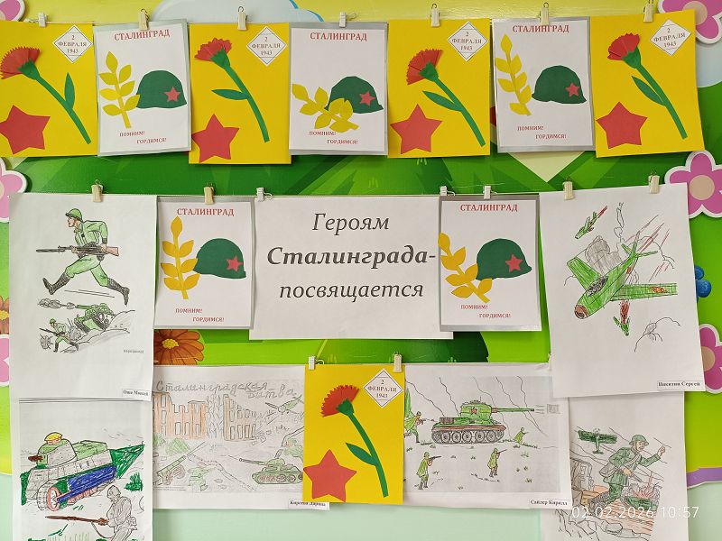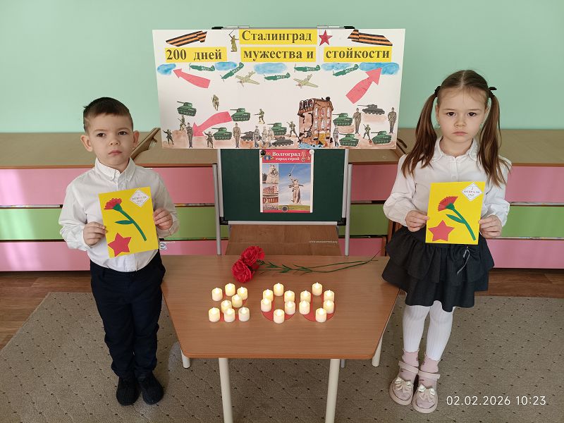2 февраля в старшей дошкольной группе прошёл познавательный час «Нам подвиг Сталинграда не забыть», посвящённый 83–й годовщине Сталинградской битвы. Ребята узнали, что в течение 200 тяжелых дней и ночей шли ожесточенные бои, что Сталинградская битва вошла в историю как начало победоносного шествия русского народа над фашизмом.