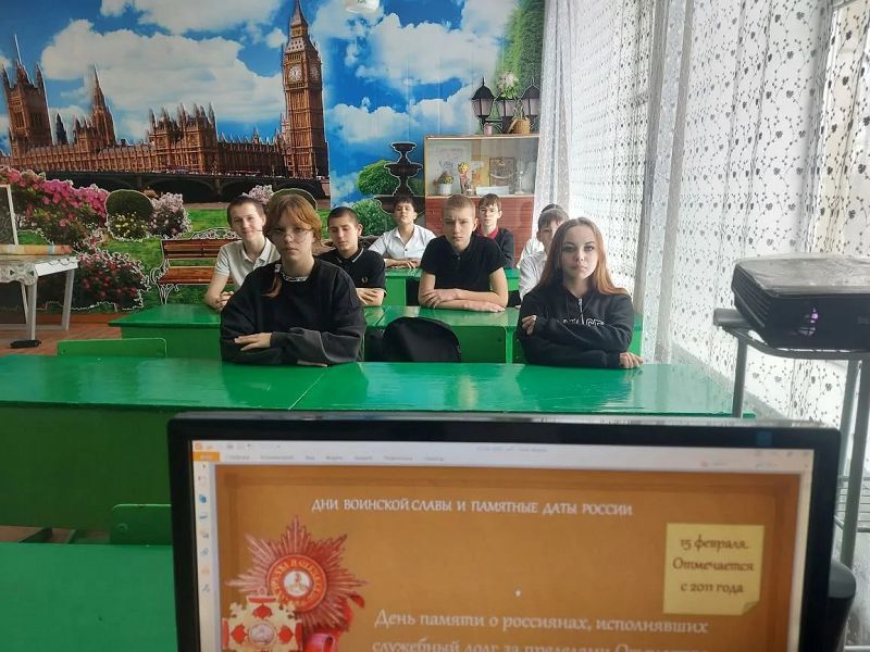13 февраля в 7 «Б» классе был проведен урок мужества "Равнение на подвиг", посвященный Дню памяти о россиянах, исполнявших служебный долг за пределами Отечества. Война в Афганистане - одна из самых трагических страниц летописи советской эпохи, где наши солдаты на протяжении 10 лет ( 1979- 1989) исполняли интернациональный долг.