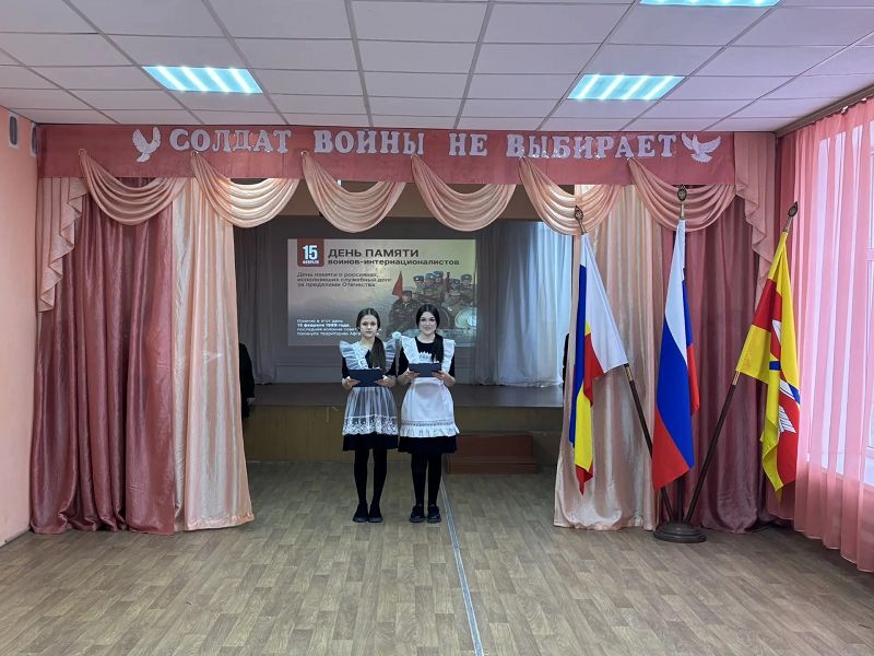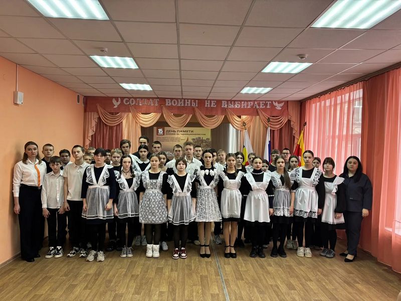 Ведущие, Белецкая Светлана и Ильичёва Диана, ученицы 11 класса, говорили об Афганской войне, которая длилась 9 лет, 1 месяц и 19 дней, о том, сколько жизней солдат она унесла, о воинах-интернационалистах. Ими были и выпускники нашей школы: Егоров Сергей, Кукарин Николай, Харченко Петр, Лебедев Игорь, Чернявский Василий, Тулупов Василий, Цирульников Игорь, Нутрецов Владислав.
