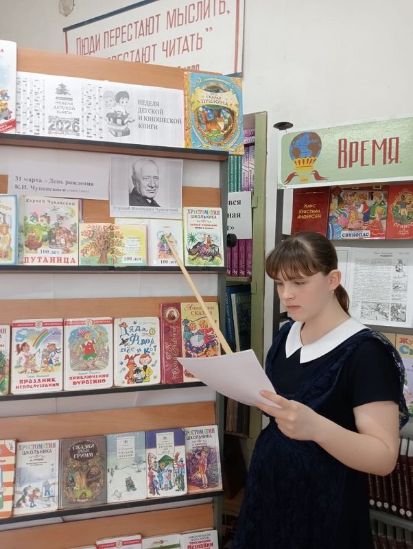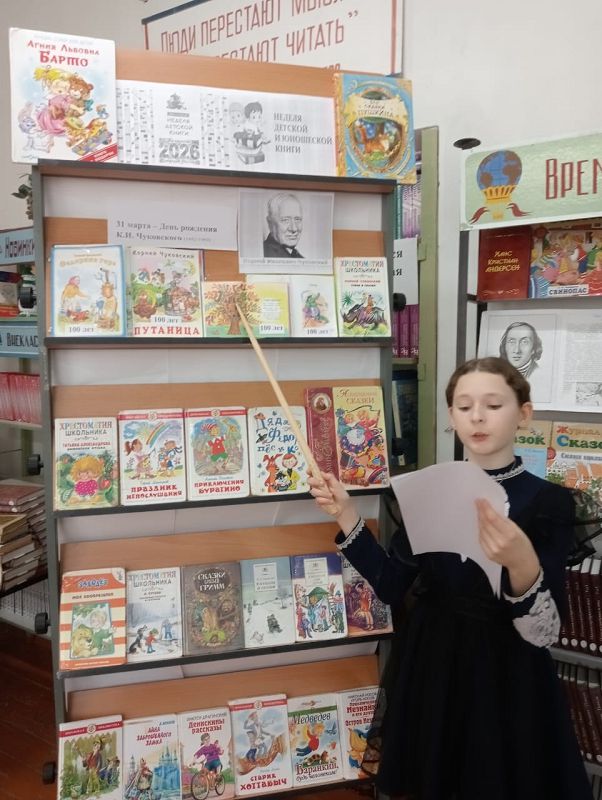 Для учащихся 6 "А" класса Наталья Александровна провела библиотечный урок "Читаем сказки К.И. Чуковского". Ребята узнали, что Всероссийская неделя детской и юношеской книги приурочена к Году единства народов России. Тема 2026 года: Сказки Корнея Ивановича Чуковского. Дети представляли сказки, которым в этом году 100 лет.