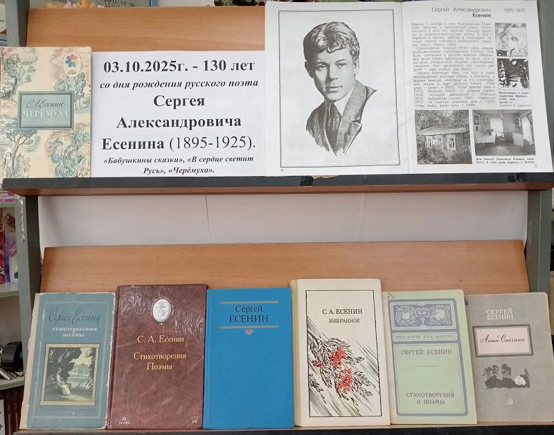 В преддверии 130 – летия со дня рождения С.А. Есенина в библиотеке МБОУ Михайловской СОШ была оформлена книжная выставка: «03.10.2025г. – 130 лет со дня рождения Сергея Александровича Есенина».