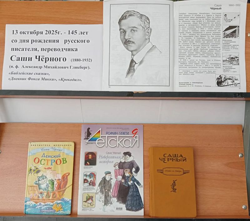 В преддверии юбилейных дат со дня рождения писателей в библиотеке МБОУ Михайловской СОШ были оформлены книжные выставки: 13 октября 2025г. – 145 лет со дня рождения русского писателя, переводчика Саши Чёрного (1880-1932). 16 октября – 115 лет со дня рождения русской писательницы, драматурга Лии Борисовны Гераскиной (1910-2010).