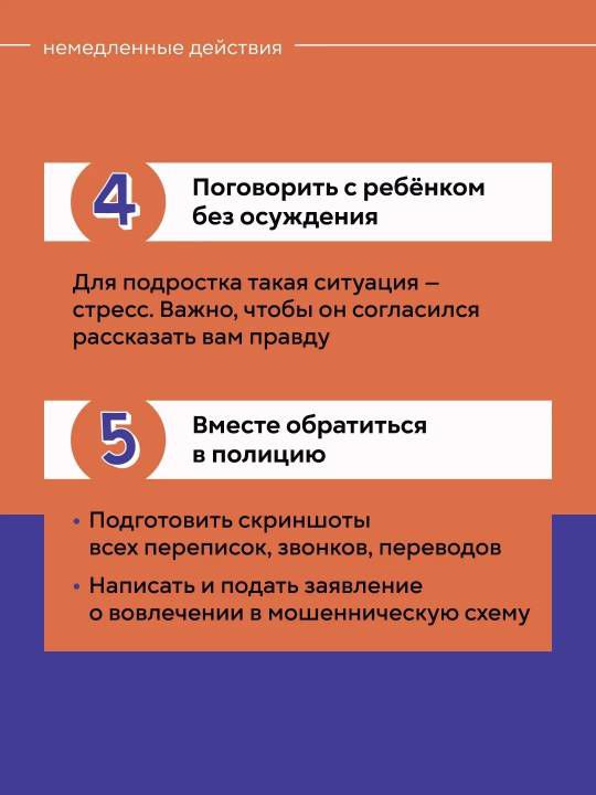 Главное правило здесь — не паниковать и не нападать. Подростки часто попадают в такие схемы из-за желания легких денег, непонимания последствий или под давлением «друзей» в сети.
