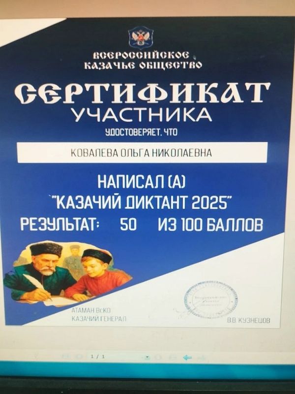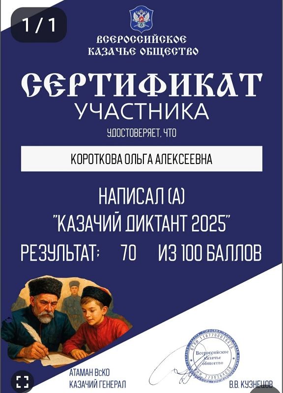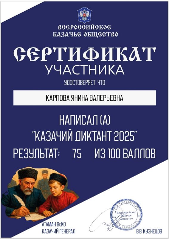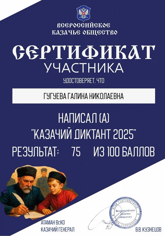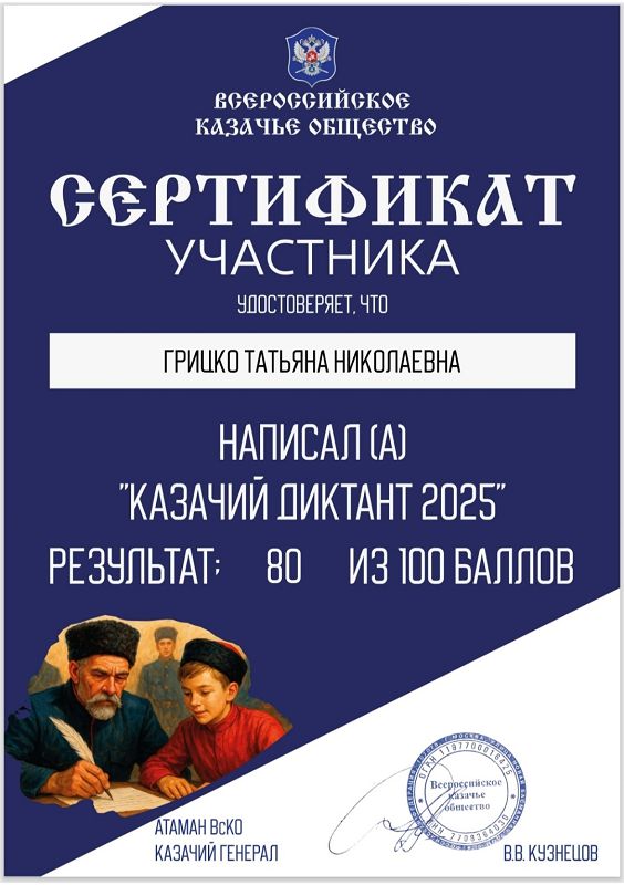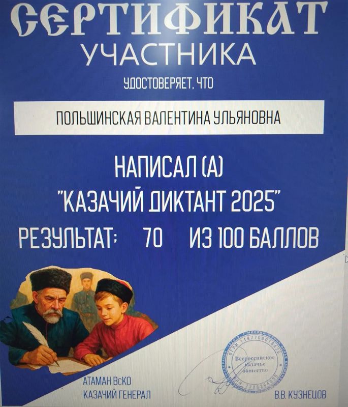 С 2 по 6 декабря 2025 года Всероссийское казачье общество, при поддержке Совета при Президенте Российской Федерации по делам казачества и Роскомнадзора, проводит Всероссийскую патриотическую общественно-просветительскую акцию "Казачий диктант - 2025". Акция проходит на онлайн-платформе казачийдиктант.рф.