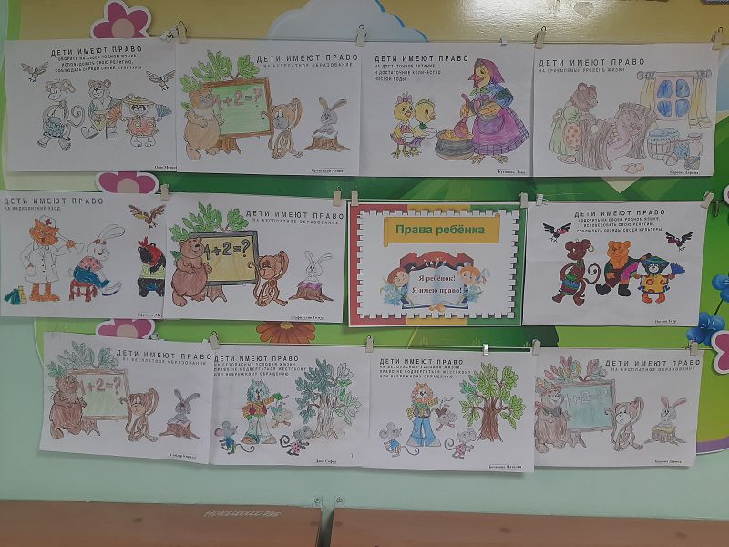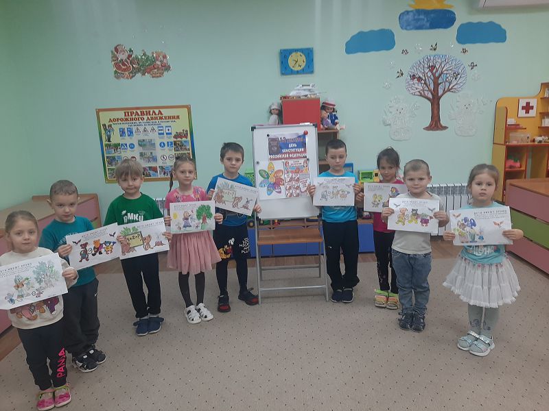 Дети в игровой форме узнали об Основном Законе России, который нужно знать и применять в жизни. Ребята познакомились с тем, какие права они имеют, какие обязанности они должны выполнять и соблюдать. С интересом ребята посмотрели презентацию «Права в сказках». Для родителей оформили выставку рисунков "Я ребёнок! Я имею право!"