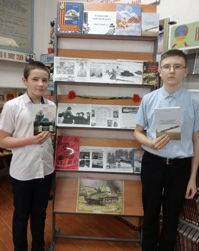 В преддверии 83 годовщины Тацинскому танковому рейду в библиотеке МБОУ Михайловской СОШ оформлены выставки: "Тацинский танковый рейд 1942-1943 гг.", "Она сражалась за Тацинку". У выставки учащиеся 6-Б класса: Божко П., Манунов А.