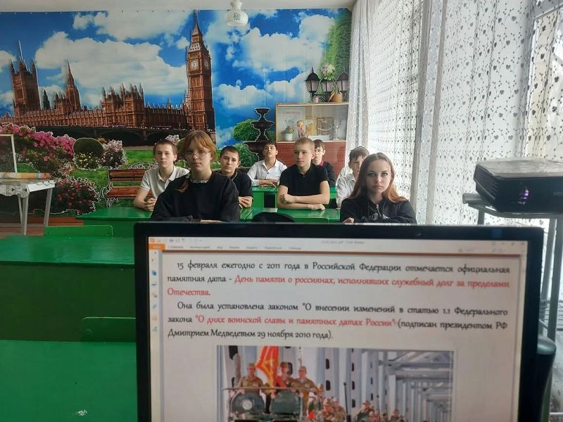 13 февраля в 7 «Б» классе был проведен урок мужества "Равнение на подвиг", посвященный Дню памяти о россиянах, исполнявших служебный долг за пределами Отечества. Война в Афганистане - одна из самых трагических страниц летописи советской эпохи, где наши солдаты на протяжении 10 лет ( 1979- 1989) исполняли интернациональный долг.